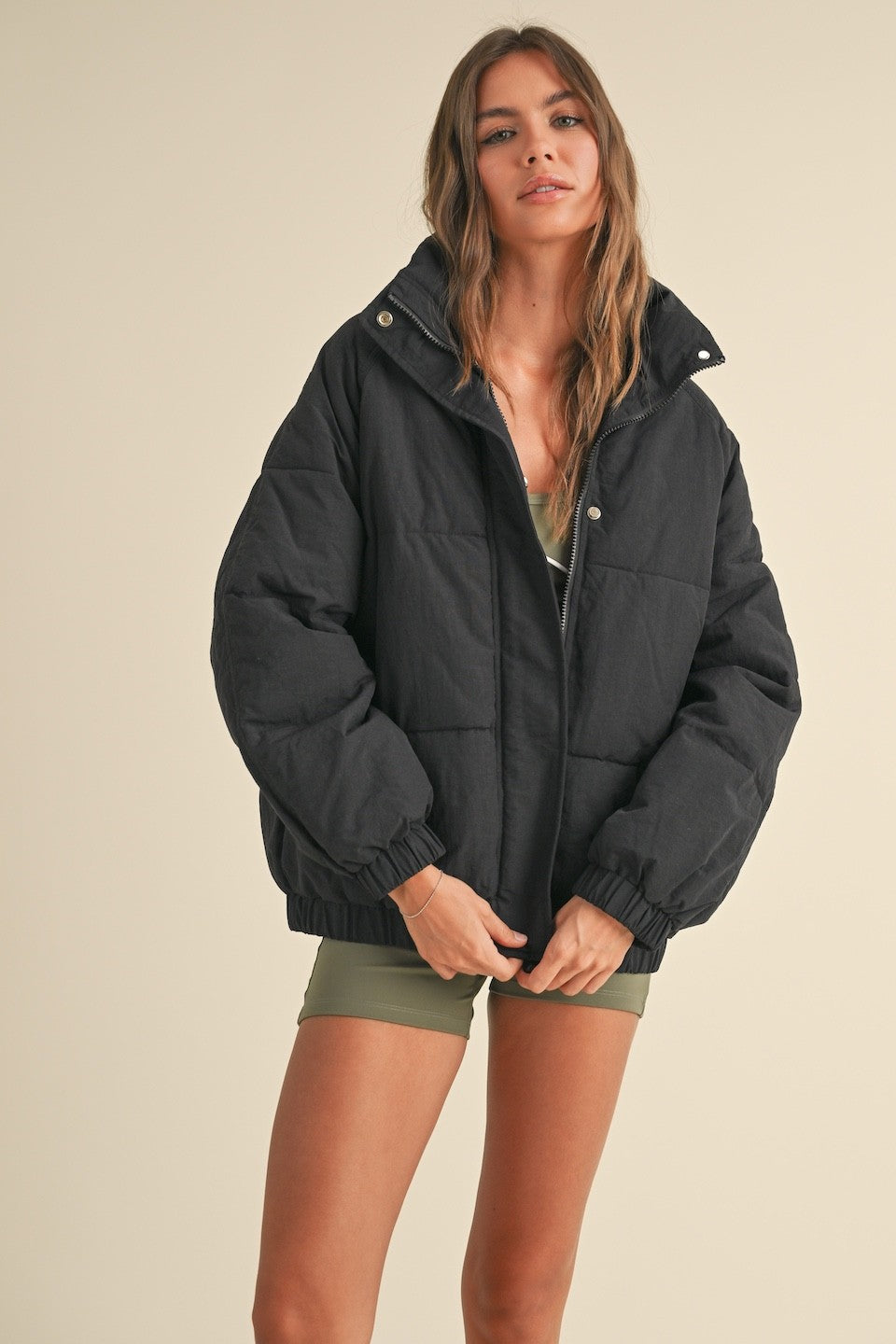 Elevate your outerwear with the Amanda Puffer Jacket. Featuring a front zip and button closure with side pockets. Perfect for chilly days or adding an edgy layer to your outfit.