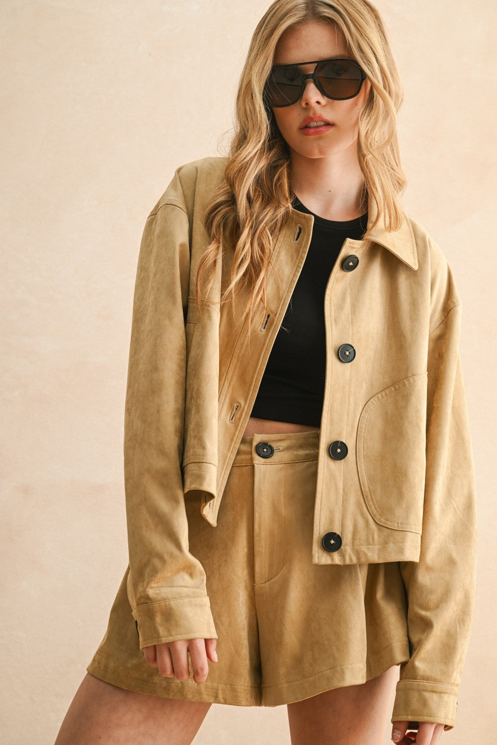 Add a sleek layer to your look with the Vanderbilt Suede Jacket. Featured in a relaxed fit with side pockets and front button closure for a classic finish. Pair with the matching shorts or easily style separately.