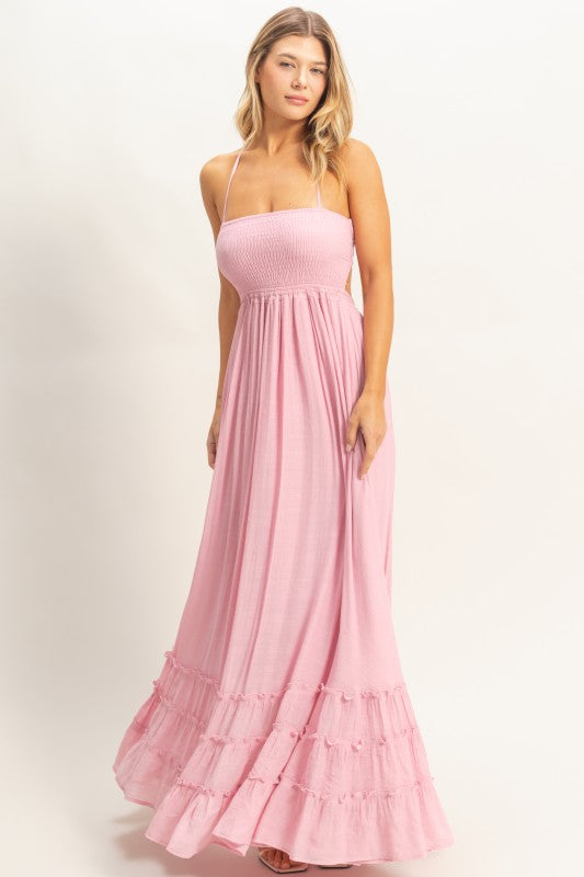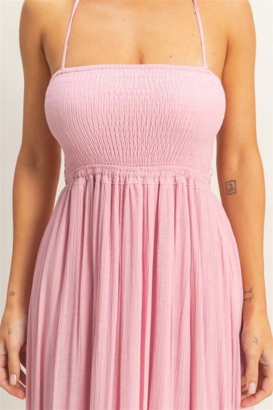 The Blind Date Halter Maxi Dress is a flirty, feminine dream. Featuring a halter tie neck, smocked bodice and ruffle hem. Pair with your favorite sandals or heels for the perfect summery vibe.