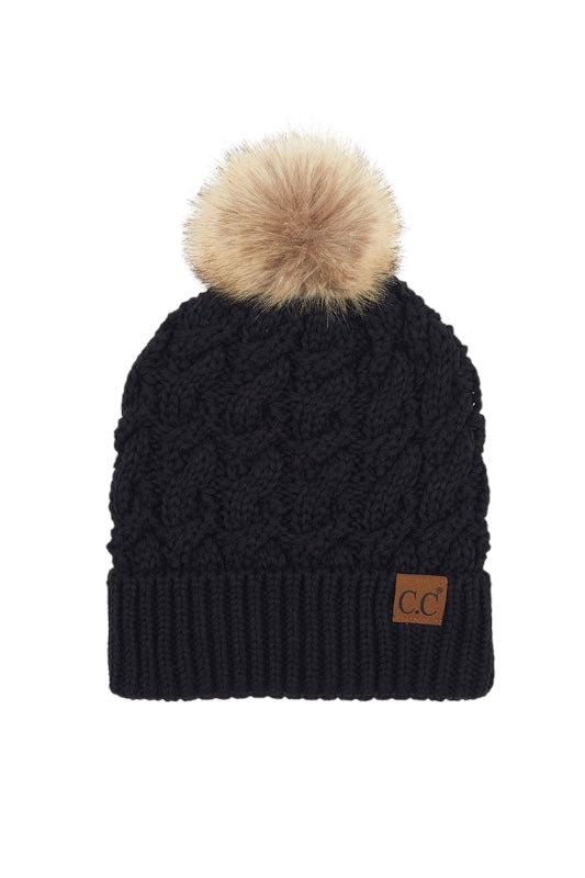 C.C RIBBED KNIT POM BEANIE - BLACK